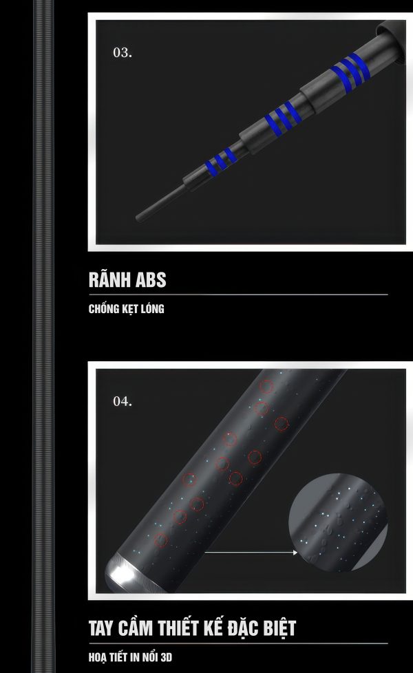 - Rãnh ABS chống kẹt lóng thông minh: thao tác rút, thu cần mượt mà, không lo kẹt.